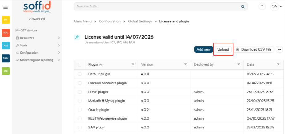 1.  The first option is to use the Soffid 4 marketplace. You can download and upload it directly from the Licence and plugin page.