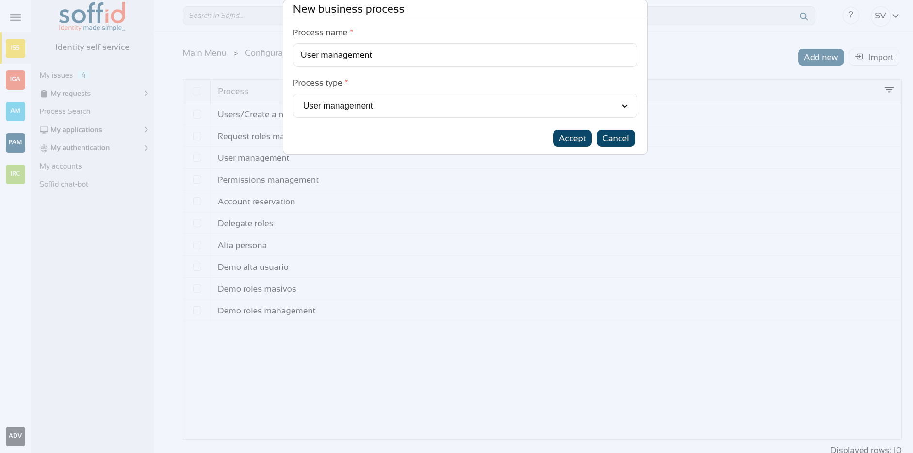 We will use two concepts to explain that process, identity, and end-user. Identity will be the identity or user that will be created, updated, or deleted in Soffid Console. The end-user will be the Soffid user who requests processes using the self-service portal.