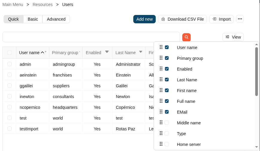 It is easy to use, once you click on the "View" button, Soffid will display a popup with the available columns for the object, then add, remove or drag and drop them in the order you want and click outside the popup, Soffid will refresh the list with the attributes with the changes that you defined.