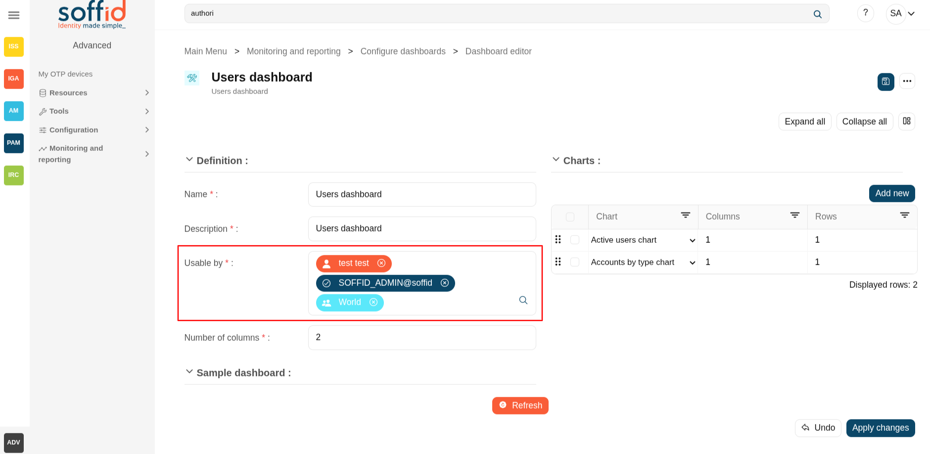 In the Dashboard editor page, the user must be included in the "Usable by" field, as a user, a granted role or a primary/secondary group.