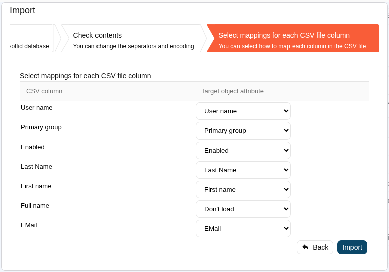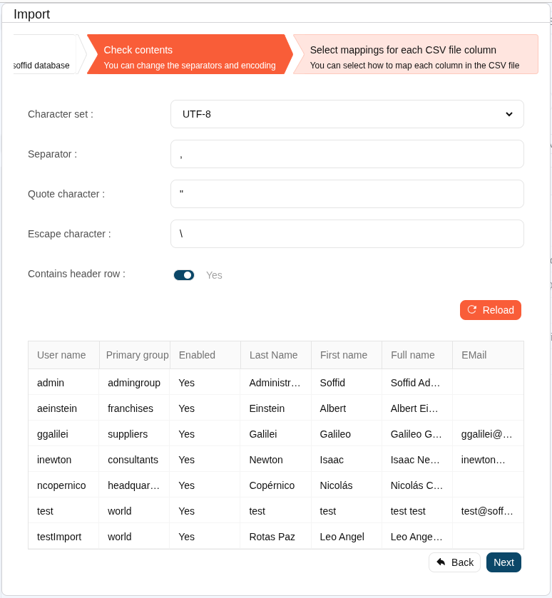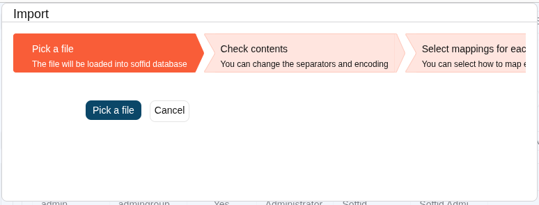 Soffid allows you to upload a CSV file with the data list to add, update or delete information to the data table. The operations that can be performed with the data import depend on the table on which the process is being performed.
