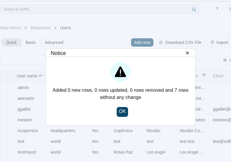 When the import process finishes, Soffid will show a message with the result of the process execution.