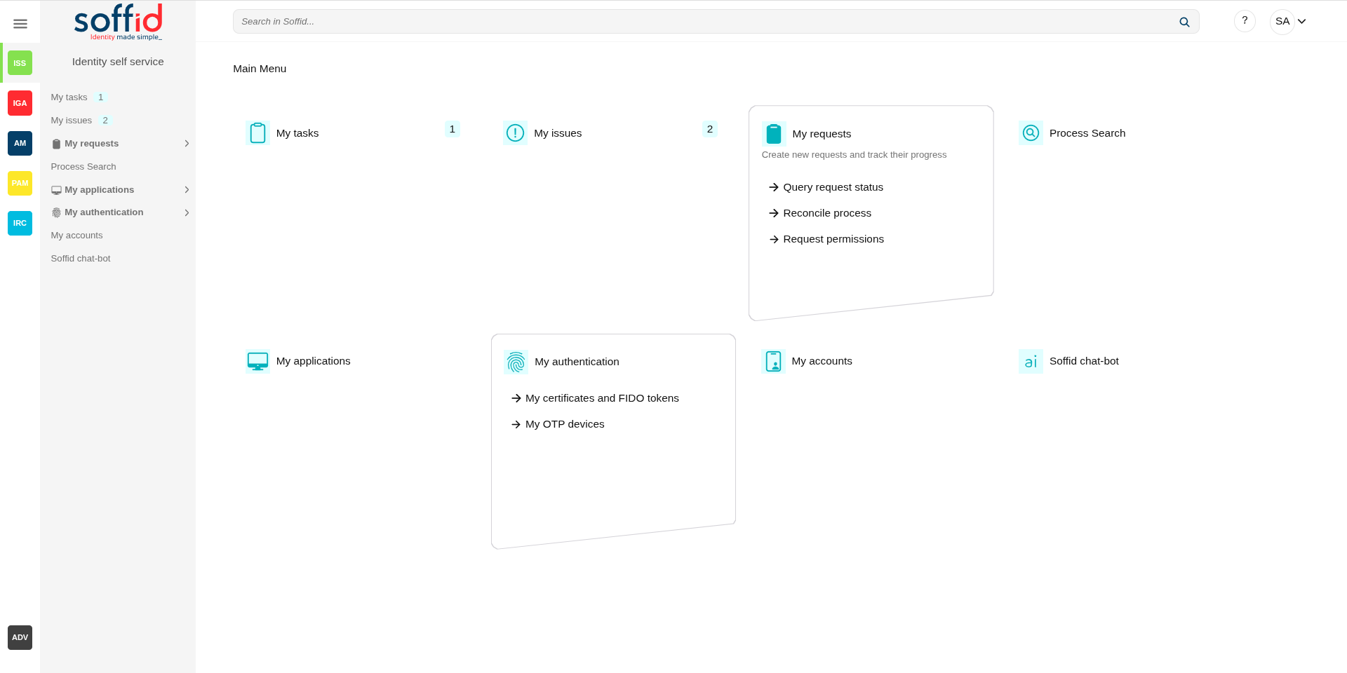Soffid allows administrator users to configure access to the different options depending on the end-users roles defined to use Soffid. In this way, end-users will be able to access the Identity self service Portal to manage their own requirements always depending on the defined business processes.