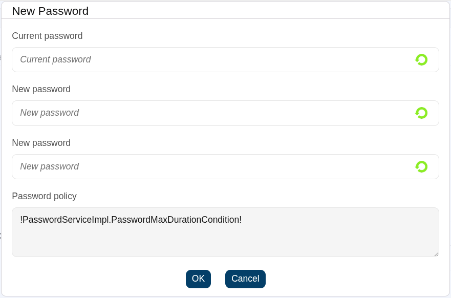 Allows the user to change their current password. Â The pop-up will display the restrictions applied according to your password policy. Â You must enter your current password. If you cannot remember it, it is best to use the password recovery option when logging in to the Console. This option is included in the password recovery add-on. |
