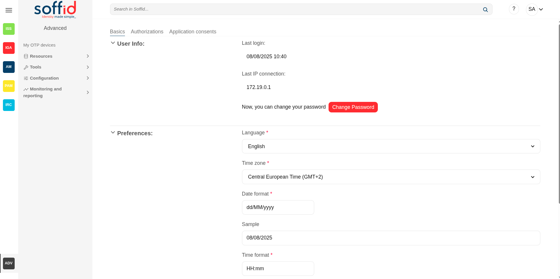 To view My Profile, you must select the My Profile option that will be displayed when you click on the drop-down menu at the top right. Then Soffid displays a new window that will allow end users to configure their profiles.