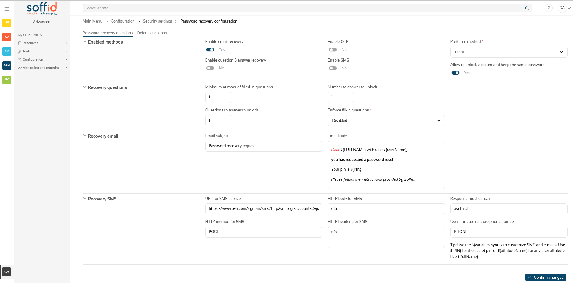- Enable OTP: if Yes is selected, an OTP will be required to recover the password. That OTP depends on the OTP settings configured into the Soffid Console and the OTP devices configured for the end-user.