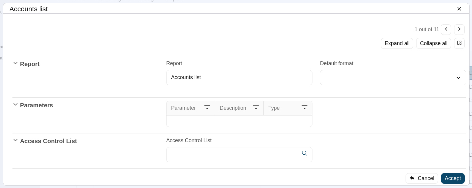 When you select a report, a pop-up window will open with the report definition so that you can view or modify it. |